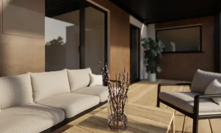 Die optionale Terrasse, bietet den Bewohnern Privatsphäre und ist auf natürliche Weise mit dem Tragwerk des Hauses verbunden.