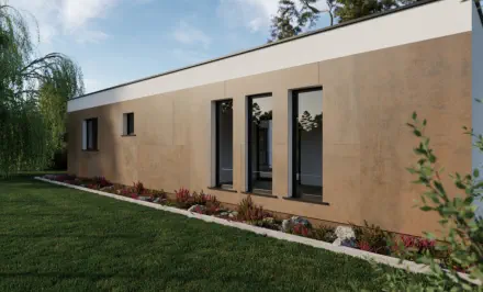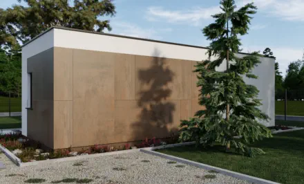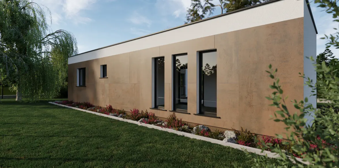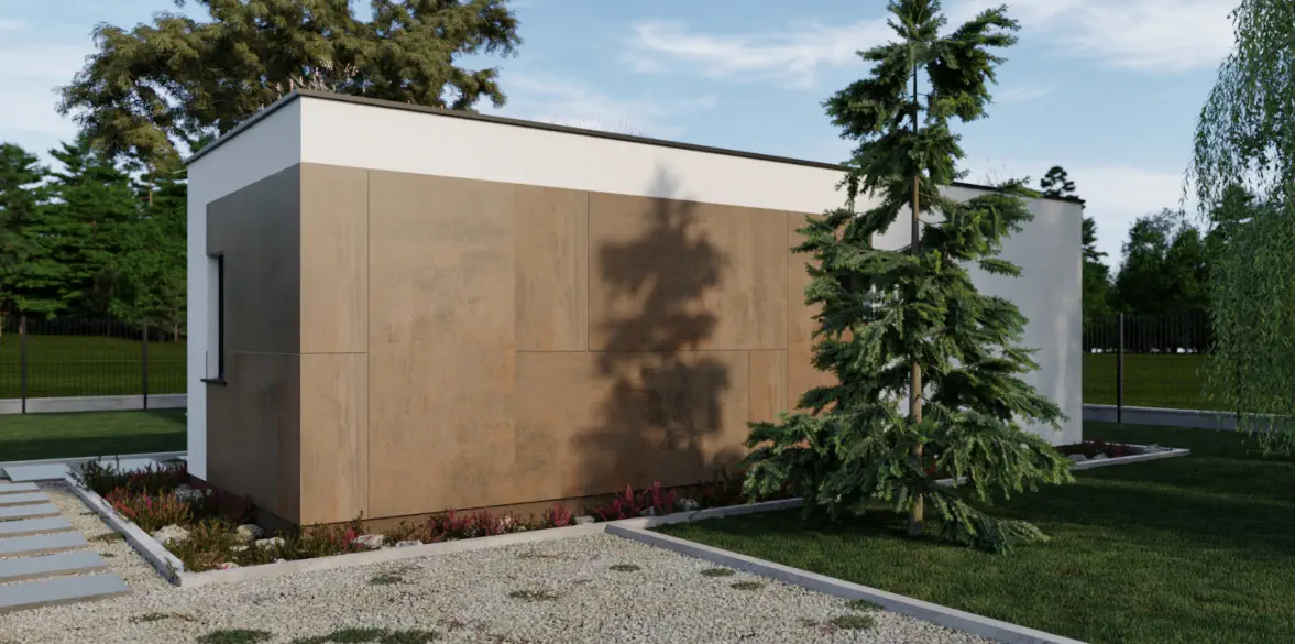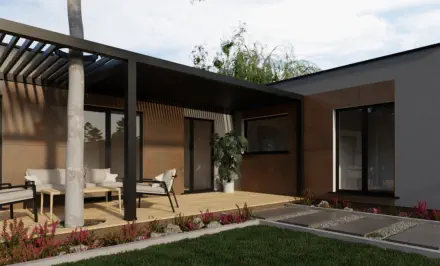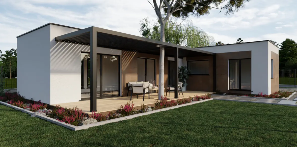 Die optionale Terrasse, bietet den Bewohnern Privatsphäre und ist auf natürliche Weise mit dem Tragwerk des Hauses verbunden.